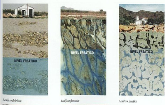 Los acuíferos son una formación geológica que está constituida por una o más capas de rocas, capaz de almacenar y ceder el agua. Estos pueden ser acuíferos detríticos los cuales su permeabilidad se debe a la porosidad intergranular (de tipo primario), acuíferos fracturados, cuya permeabilidad se da a través de las fracturas (de tipo secundario) y los acuíferos kársticos, los cuales no se consideran homogéneos y cuya permeabilidad depende del grado de desarrollo del endokarst y de los cuales hablaremos más a detalle a continuación.