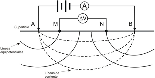 El más común es el método de geofísica eléctrica, el cual consiste en hacer pasar una corriente y medir el diferencial de voltaje, al cual se le conoce como resistividad eléctrica, medida en Ω.m. El levantamiento geofísico se realiza por medio de Sondeos Eléctricos Verticales, los cuales, debido a que la presencia de materiales que faciliten la conducción eléctrica o electrolitos (por ejemplo, el agua) pueden afectar drásticamente las propiedades eléctricas de las formaciones geológicas, los métodos eléctricos poseen especial relevancia en la exploración de acuíferos, contactos estratigráficos y minerales metálicos.