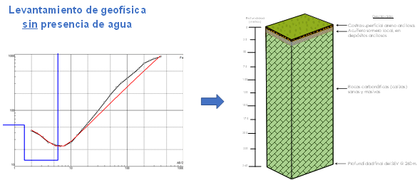 Los datos de campo son procesados por softwares especiales para geofísica e interpretados según la geología del lugar para generar la interpretación litológica del subsuelo y la existencia y profundidad de un acuífero. A continuación se presentan 2 casos de levantamientos de SEV en el área de Cobán, el primero sin presencia de agua y el segundo con presencia de agua.
